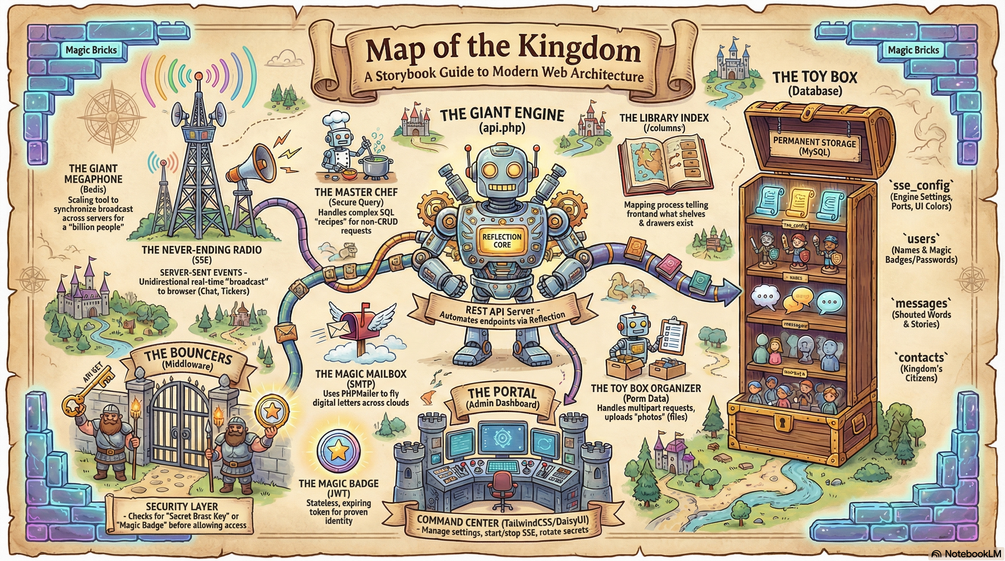 Forget the jargon. Meet the Giant Engine (a robot that writes your API for you), the Bouncers (who secure your data), and the Never-Ending Radio (Real-Time SSE).